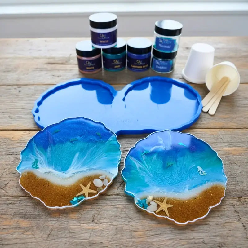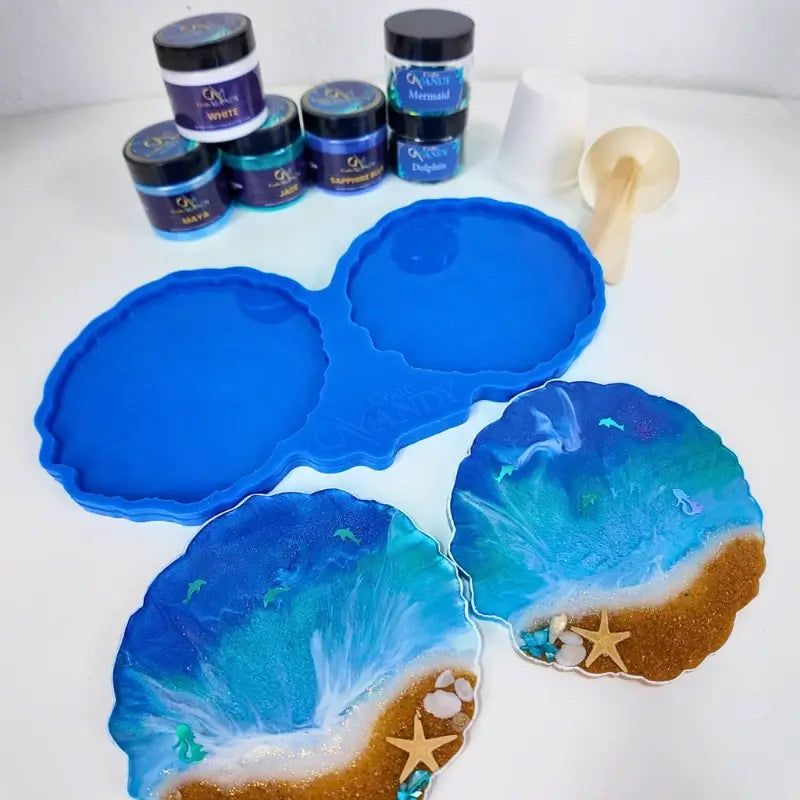 1. Con resina epóxica y pigmentos: Mezcla tu resina con nuestras micas o pigmentos en pasta Crafty Mandy TX para lograr efectos metálicos, perla o tornasol. Puedes combinar tonos de Micas Powder como Maya, Jade, Sapphire Blue, para un estilo oceánico.