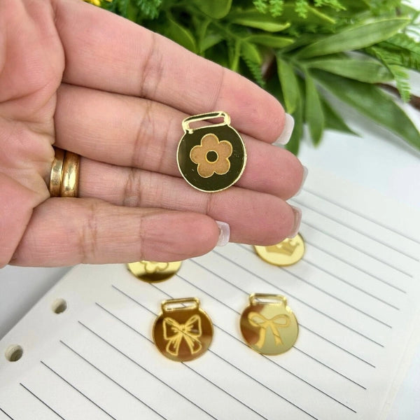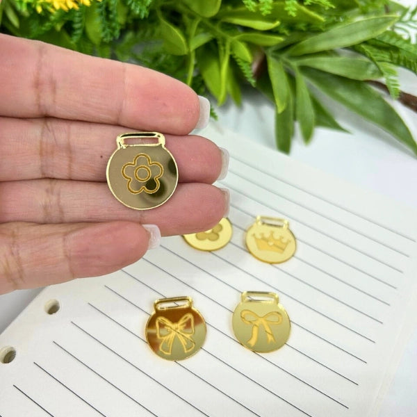 Diseñado en acrilicos tipo espejo, es el accesorio ideal para marcar páginas con estilo. Perfecto para personalizar agendas, cuadernos o diarios, este colgante combina funcionalidad y diseño sofisticado.