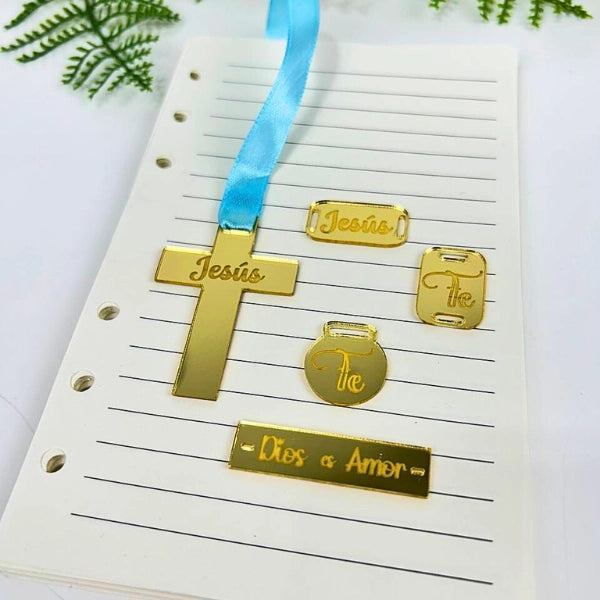 Hechos en acrilico tipo espejo con grabados en diferentes diseños, son ideales para añadir un toque especial a tus personalizaciones de agendas, libretas etc.